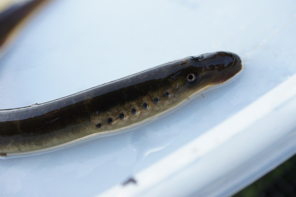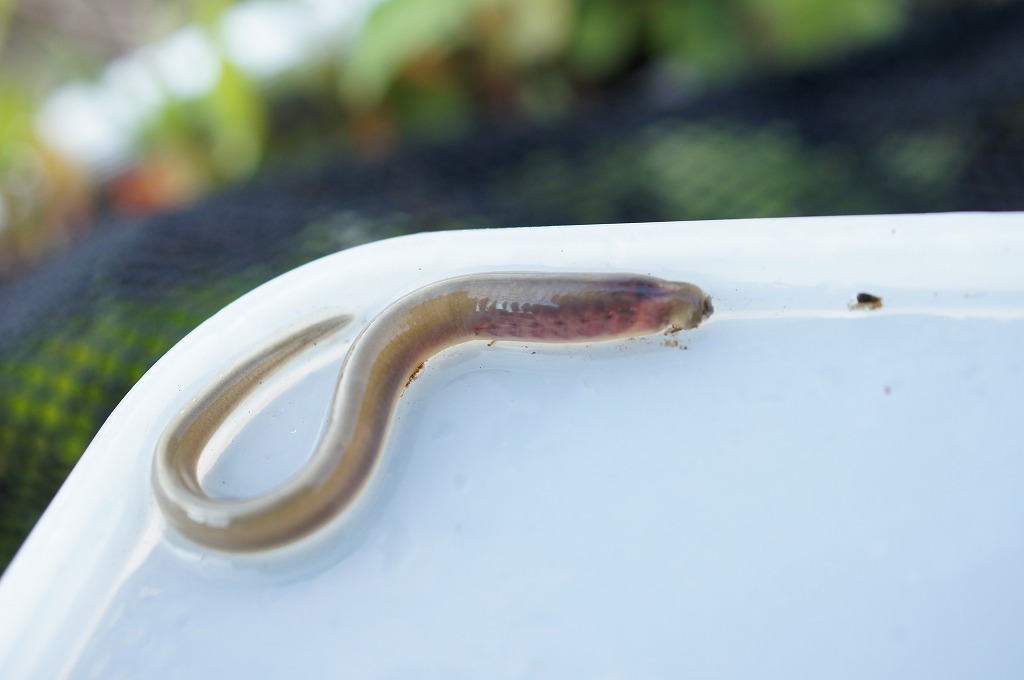 ビタミンAが豊富なので、20cm弱の個体を食用に持って帰りました。右の写真はその幼生。幼生はアンモシーテスと呼ばれ、目が未発達でミミズのような見た目をしています。