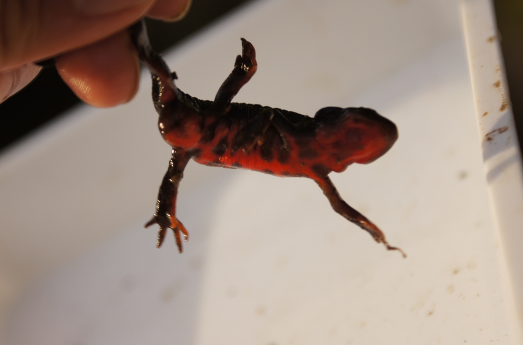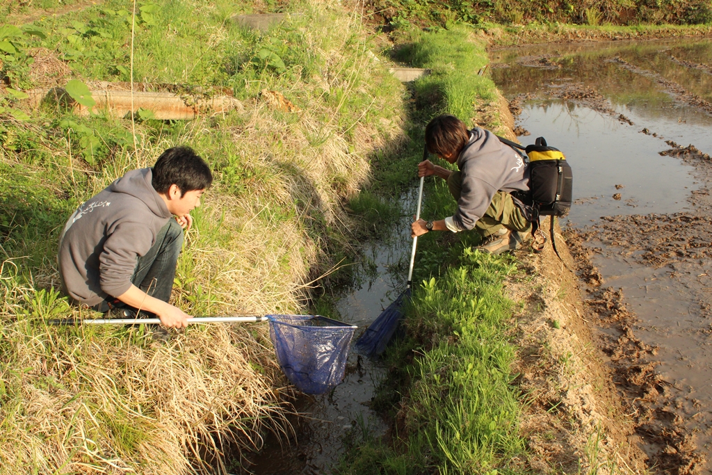 クジャクチョウ孔雀の羽のように美しい目玉模様を持つ蝶。谷戸の田んぼの脇の水路をひたすら網でガサガサします。オオコオイムシ卵を背負った雄個体。ミズカマキリキンブナよく肥えているので抱卵個体と思われます。今回見られた魚はキンブナとドジョウのみでした。続いて両生類ヤマアカガエルアマガエルツチガエルすごい貫禄!アカハライモリ今回の目的はこいつでした。1匹しか見つからなかったものの、久しぶりに会えて嬉しい。私を含め参加者3人と少人数でしたが、半年ぶりの谷戸は楽しかったです。次は後輩を連れて来たいところです。投稿:ARIA班長かわんちゅ撮影:かわんちゅ・カジクン
