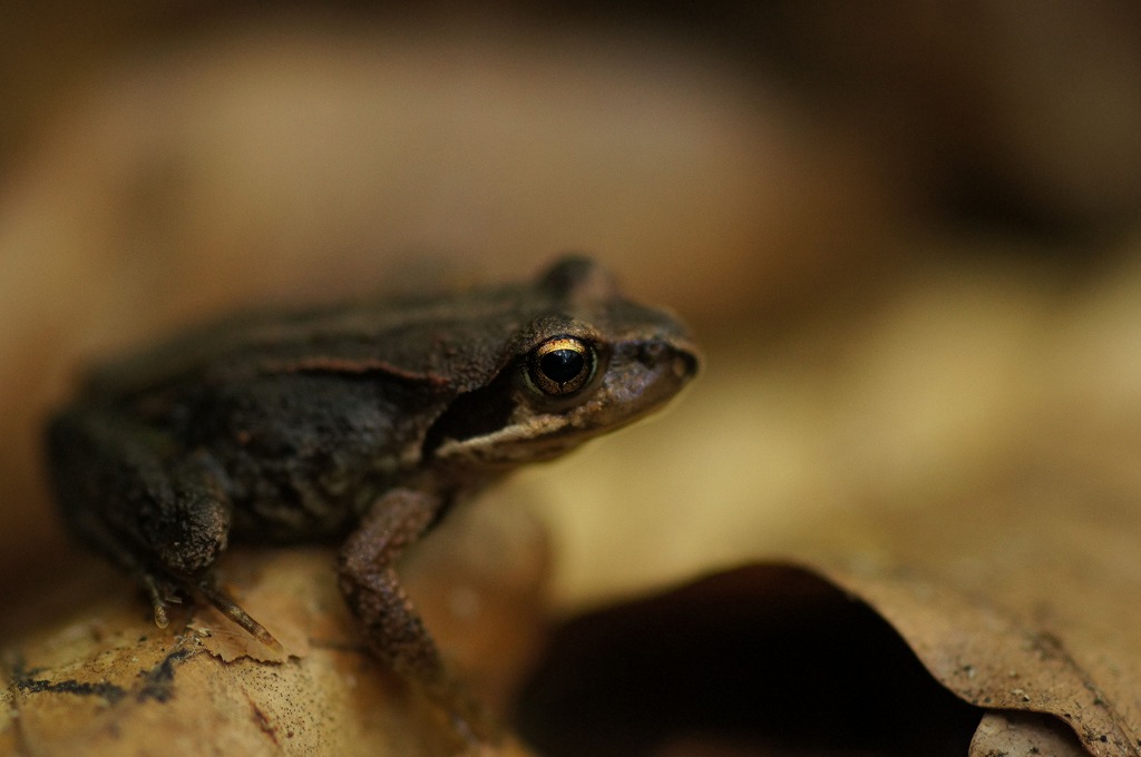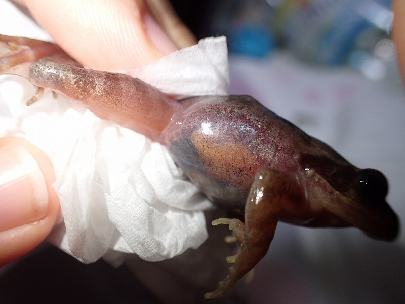 虹色細胞が欠乏しているため全体的に透けて見えます。 これは通常の個体。色彩が金色ではっきりしています。また、ちょうど一年前にはアマガエルの同じく虹色細胞が欠乏した色彩変異個体を採集しています。投稿・撮影:かわんちゅ