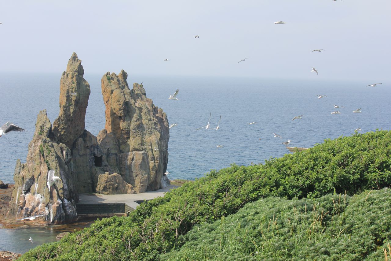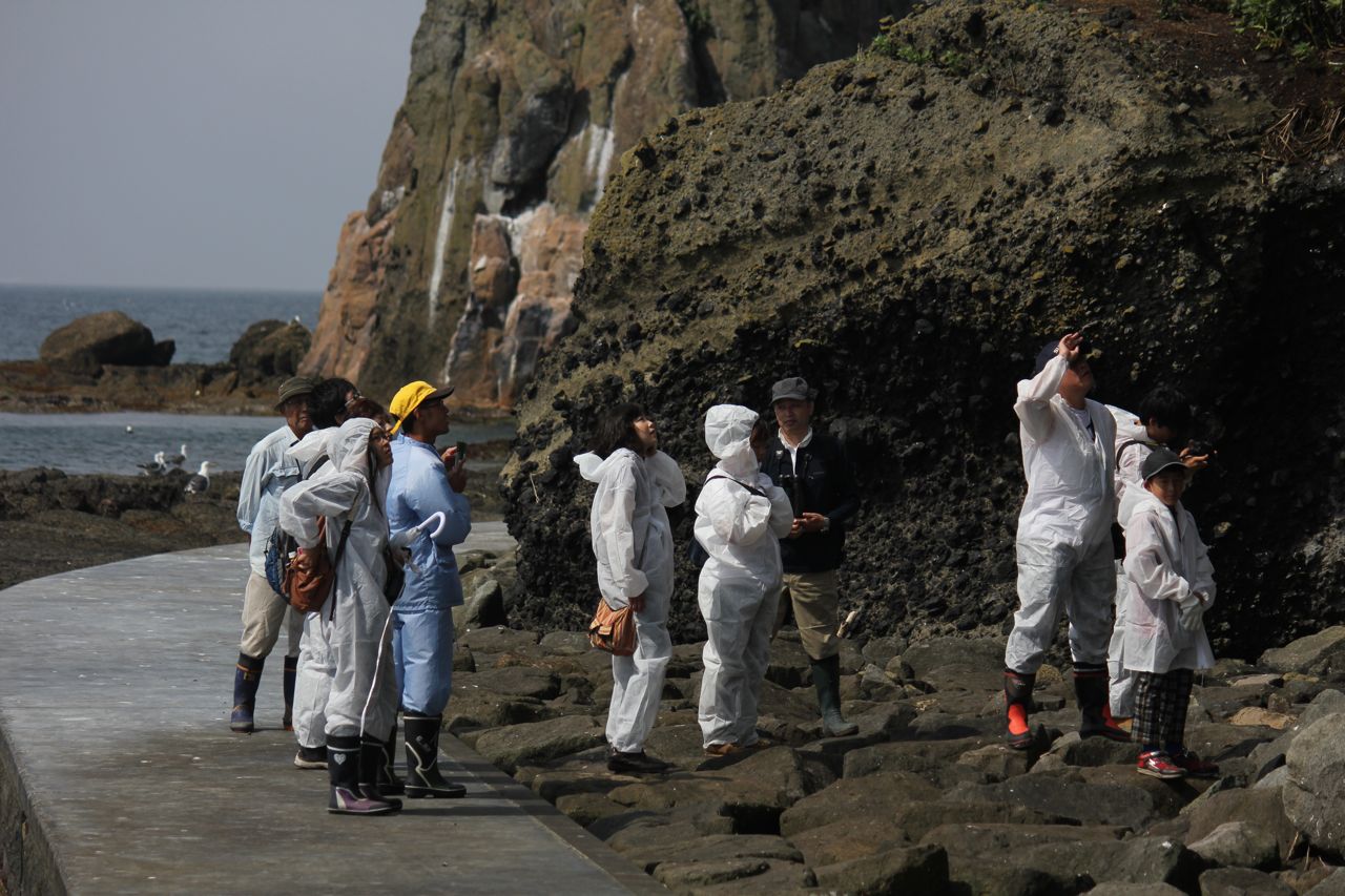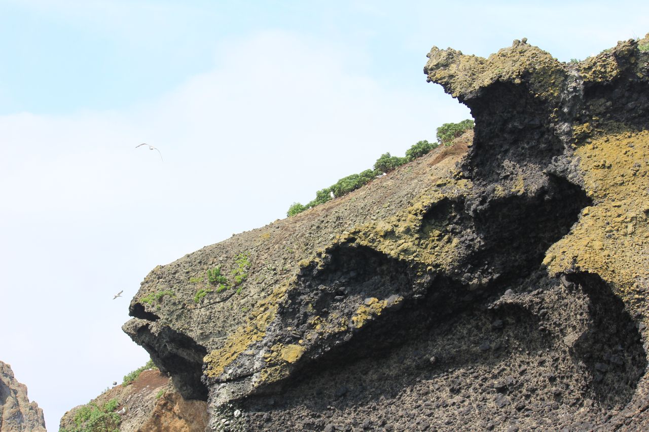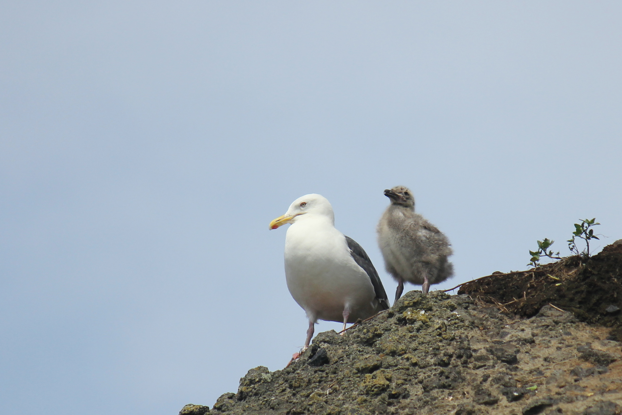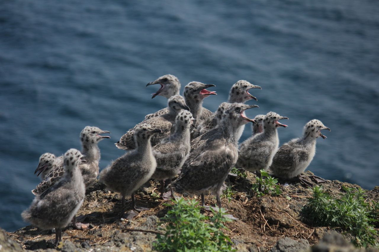 断崖絶壁の上で寄り添うオオセグロカモメのヒナたち。