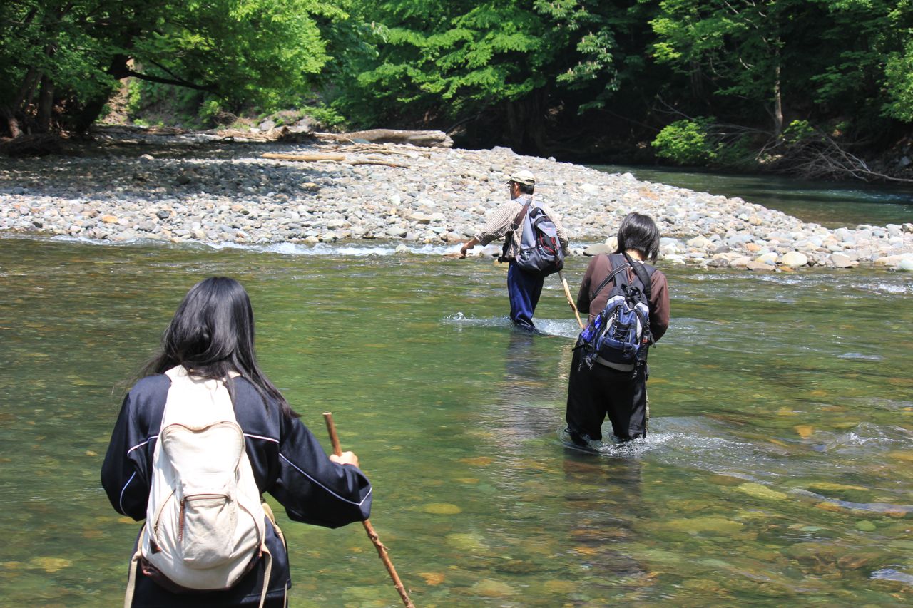 文「川をザプザプ渡っていきます!沢歩き?いいえ、川です!腰まで浸かります!」