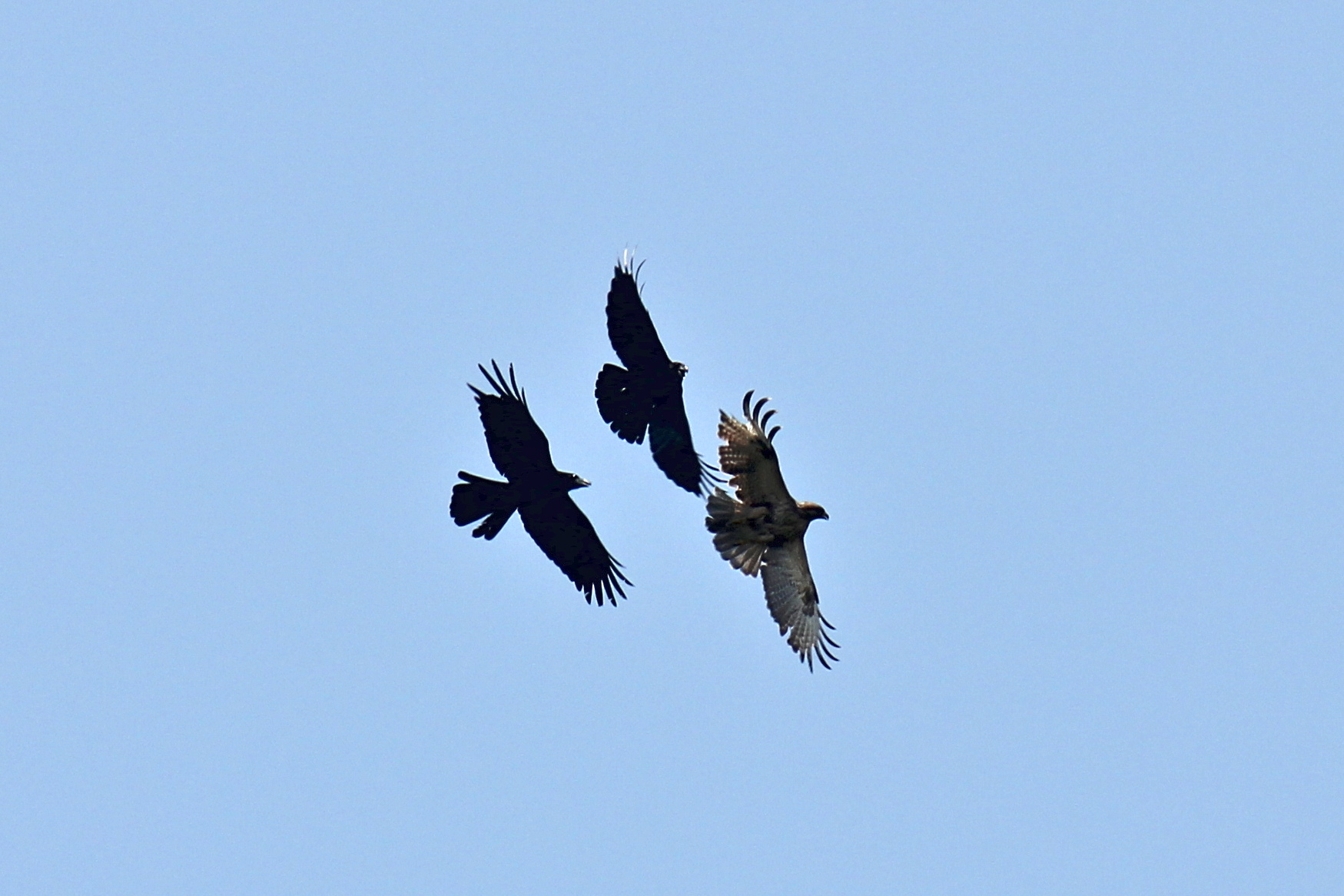 道中、ハシボソカラスのカップルとのノスリさんの熾烈な空中戦!